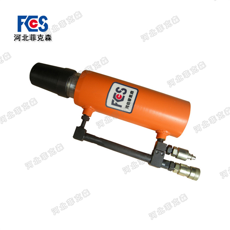YDC-180型張拉千斤頂由外缸、中缸、內(nèi)缸、錨杯和固定在內(nèi)缸上內(nèi)置工具錨、頂壓器等組成。使用時(shí),先將張拉千斤頂?shù)闹懈淄嘶氐阶畹臀恢?,把鋼板(托盤(pán))、外置錨具等套放好,把鋼絞線插入張拉千斤頂?shù)捻斂變?nèi)約150mm,使頂壓器頂緊外置的錨具體,其鎖片則在頂壓器的凹孔內(nèi)可自由退縮,然后使中缸頂出,在中缸頂出的過(guò)程中由于退錨環(huán)脫離固定的內(nèi)置工具錨而使內(nèi)置工具錨的鎖片在彈力推動(dòng)下鎖定鋼絞線,從而在中缸頂出時(shí)鋼絞線不斷被拉伸,外置錨具連同鋼板(托盤(pán))則不斷被頂緊,當(dāng)中缸到頂?shù)筋A(yù)定位置后,退回外缸,外置錨具的鎖片鎖定鋼絞線,從而使鋼絞線處在承載狀態(tài)。頂板則被牢牢托住。中缸退到底后,內(nèi)置工具錨的鎖片松開(kāi),將張拉千斤頂取下。