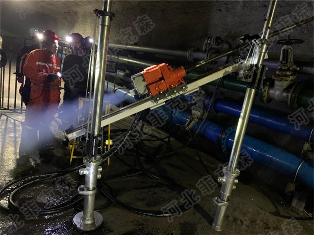 隨著開采的推進,工作面條件越來越復雜,頂板下沉、底板鼓起局部瓦斯積聚等不利因素對礦用電器的安全要求也越來較高,在以往采用電為動力的礦用鉆機受到很大的局限性,不能滿足特殊條件下的鉆探工作。其體積重量大、需要敷設電纜、布置電器開關、安設排水泵等特點給工作帶來了很大困難,而采用壓縮氣體為動力源的大功率氣動架柱式鉆機彌補了這些缺點。菲克森氣動架柱式鉆機是專門為瓦斯?jié)舛雀咔揖虏灰资褂秒娫吹南锏涝O計,以壓縮空氣為動力,主要使用螺旋鉆桿和硬質合金鉆頭回轉鉆進。廣泛用于煤礦煤層探水、注水、探排瓦斯等的鉆孔施工。主機具有正反轉功能,可以輕松鉆進和推出鉆具,給進采用獨立 馬達,給進力大、故障率小、通過控制氣量,輕松調(diào)節(jié)進給速度,雙重消音器結構,使噪音降低。且主機、立柱、導軌、支架即插即用,搬運方便,有效改善工作環(huán)境,降低了工人的勞動強度。